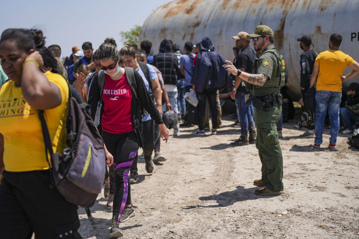 2022年5月20日,一名边境巡逻人员在德克萨斯州鹰关附近面对着一大群非法移民。(Charlotte Cuthbertson/The Epoch Times)