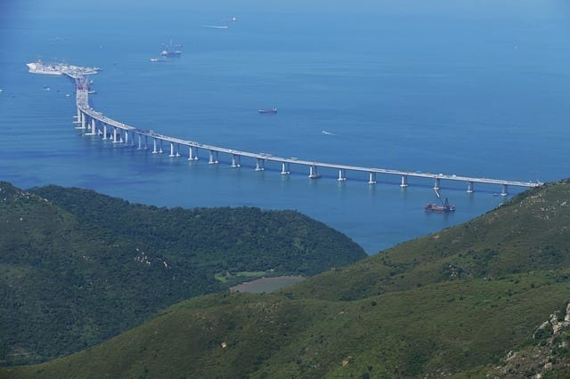 2018年10月开通的港珠澳大桥,是连接香港大屿山、澳门半岛和广东省珠海市的大型跨海通道,现为世界上最长的沉管隧道,及世界跨海距离最长的桥隧组合公路。