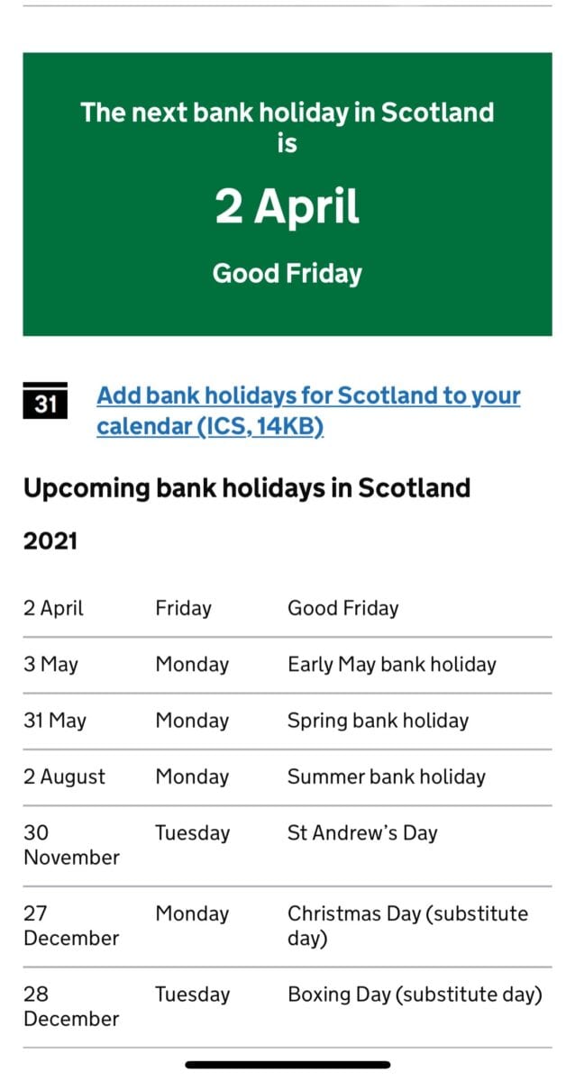 苏格兰即将来临的银行假期(图片来源:英国官网截图)