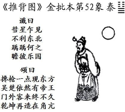 当然,上一篇说过木星留守的大周期是344年,也就是每隔344年,如1673年,就会有与2017年极为相似的“岁在角亢”的天象,但是,这并不是说“乾坤再造在角亢”还可以指那些周期——因为解《推背图》最忌讳的就是盲人摸象,孤立解读。结合“搀枪一点现东方”的哈雷彗星周期(76年),那么5000年的人类文明史,就仅有一次了。如果再结合“吴楚依然有帝王”、“门外客来终不久”,这两个特征,除了2017年,恐怕地球的历史中,再难找到其它答案了。