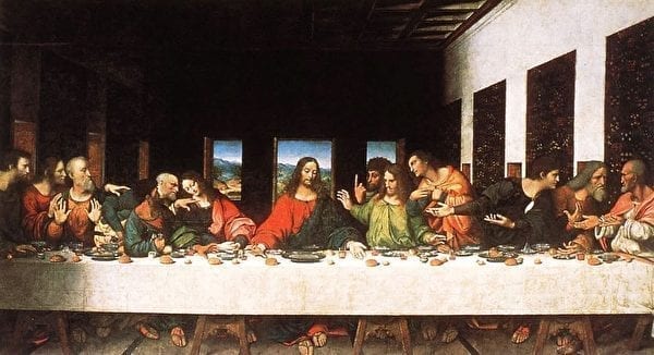 这幅《最后的晚餐》,是欧洲文艺复兴时期著名的画家达芬奇的名画,是人类艺术史上的巅峰之作。画的是耶稣受难前夕,和他的12位弟子共进晚餐的场景:耶稣预言了自己的死难,宣布他的这12使徒中,有一个人出卖了他,弟子们震惊地凝固在了那一时刻。