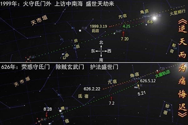 其实,玄武门之变,是像《圣经·启示录》预言的天地正邪大战一样,也是一场宇宙大战,是1999年末劫正邪大战的先验,这两次事件的天象非常相似,见图1 。氐宿是天子之宫,火星顺行留守(拐弯)在氐宿的西北面(注意天象和人间如照镜子,天象图的方位是“上北下南、左东右西”),战神火星对应的战场,就在皇宫的西北,玄武门的位置。