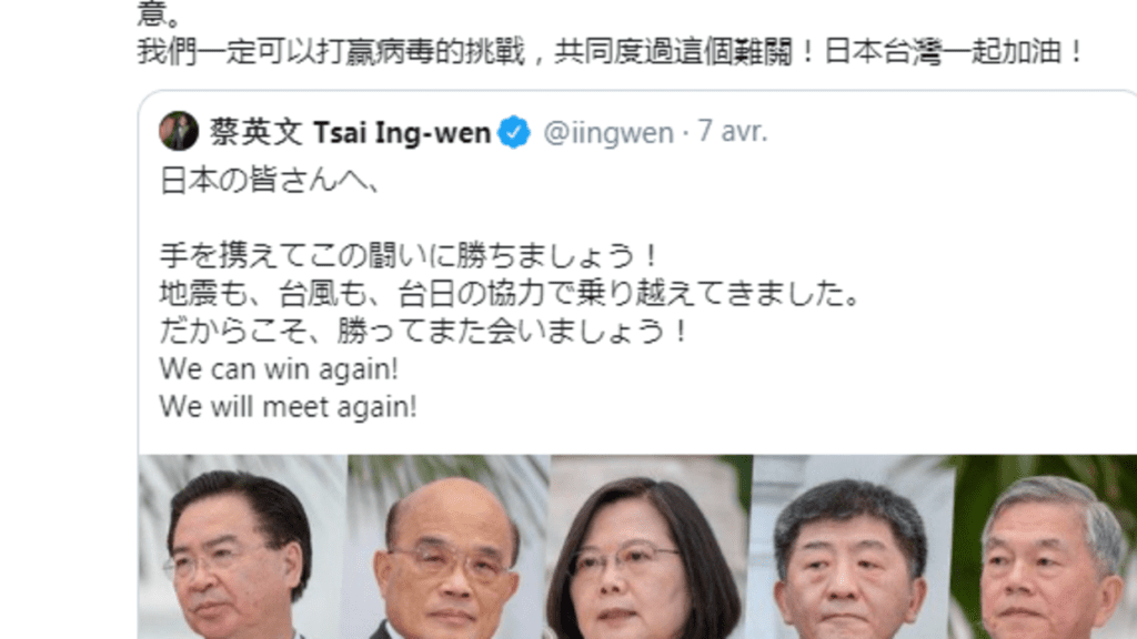 日本《讀賣新聞》報導,中華民國總統蔡英文4月7日在日本發布「緊急事態宣言」後,在推特上用日文表達台灣願與日本合作抗疫。蔡英文寫到:日本各位,攜起手來,打贏這場戰鬥吧。無論是地震還是颱風,都通過台日合作戰勝了。正因為如此,我們還會在勝利後再見。
