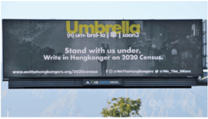 在美港人團體號召在2020年美國政府的人口普查填寫「香港人」,在洛杉磯的大型廣告看板上刊登示威者的身影。(圖/中央社)