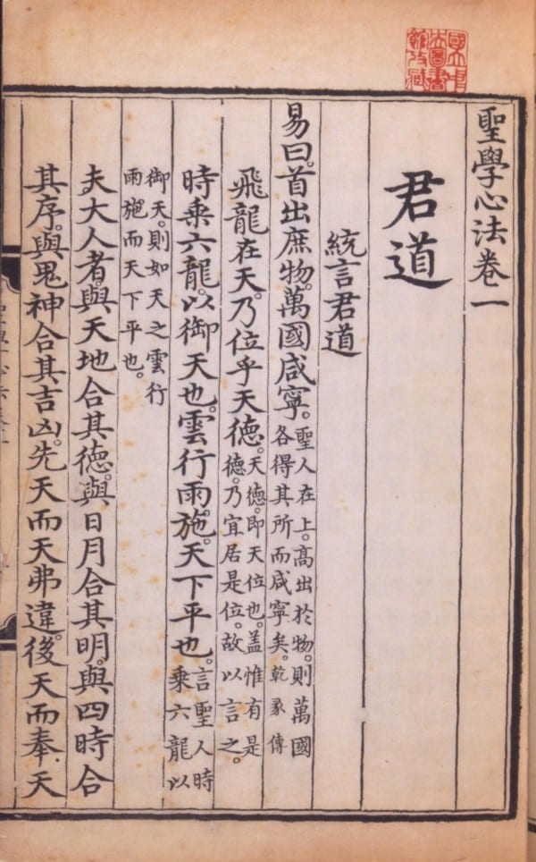 《圣学心法》则分为序言、君道、臣道、父道、子道4部分,其中“君道”再分26子目、“臣道”再分5子目。