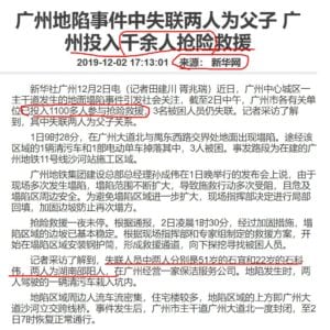 【2019年12月03日】(歐洲希望之聲訊)12月1日上午9時許,十一號線沙河站施工區域突然出現路面塌陷,當時從湖南來到廣州務工的石姓父子,連人帶車跌入巨坑,據報共有3人被困,新華社聲稱,當時有千餘人參與緊急救援。但出事父子的兒媳喻妮卻稱,官方見死不救,用回填的方式抹去他們最後一線生機。