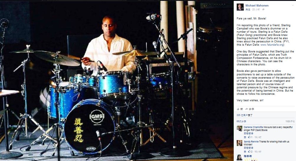 摇滚巨星大卫‧鲍伊在与癌症搏斗18个月后,周日去世。脸书上有很多悼念的留言,其中包括一条来自加拿大著名影星兼导演 迈克尔‧马洪(Michael Mahone)的留言,里面上传了一张鲍伊乐队鼓手的照片,里面的鼓上有耀眼的“真善忍”三个字,并讲述了鲍伊和这三个字背后的故事。