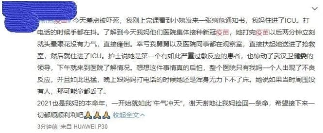一位武汉医护的亲属近日在微博发文称,其母亲的医院集体接种疫苗,结果母亲打完疫苗就直接晕倒,随后被送进ICU,事件都惊动了武汉卫健委。其母亲还称,如果当时周围没人,可能就没命了。
