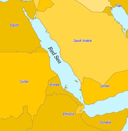 红海位于非洲东北部与阿拉伯半岛之间,形状狭长,从西北到东南长1900公里以上,最大宽度306公里,面积45万平方公里。红海北端分叉成二小海湾,西为苏伊士湾,并通过贯穿苏伊士地峡的苏伊士运河与地中海相连;东为亚喀巴湾。