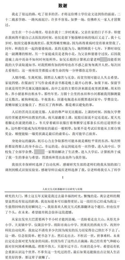 4月18日,中科院博士黄国平的论文致谢词截图在网络流传。黄国平详细介绍了自己不幸的童年:母亲12岁离家,父亲17岁去世,他自己则是在贫病交加下几次险些放弃学业。高中前家里的生活来源就是夜里抓黄鳝,周末钓鱼、养小猪崽和出租水牛,卖黄鳝的钱经常被父亲拿走买酒吃肉;自己上学因拖欠学费记不清被老师约谈了多少次;照顾他17年的婆婆去世,下葬只有一口薄薄的棺材;家中唯一的老狗也在给父亲和婆婆守坟后不知所终何处……他在高中时期,被“胡叔叔”资助生活费才能考上大学;到了大学拿到奖学金,才治好了胃出血和胃溃疡,有机会重新认识这个世界。