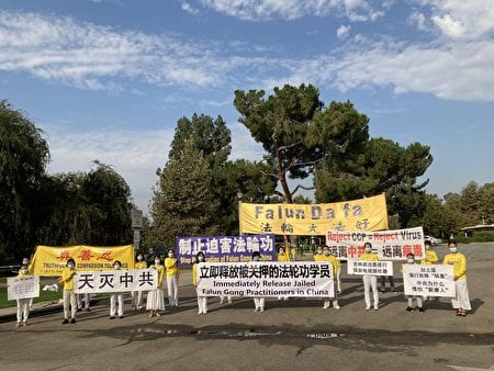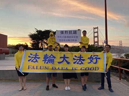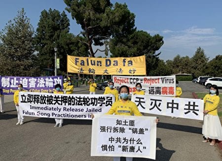 “我站在这里抗议中共对法轮功长达二十一年的迫害,修炼法轮功属信仰自由,法轮功讲真相也是言论自由符合中国宪法。”金学哲说。